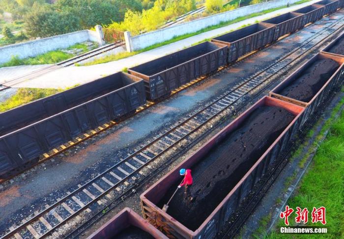 資料圖:工人整理貨物列車上的電煤。 胡國(guó)林 攝