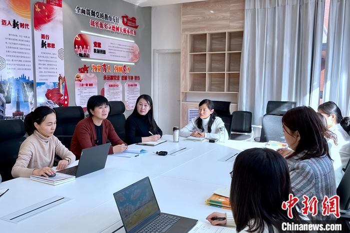 全國(guó)人大代表、寧夏銀川市二十一小學(xué)黨總支書(shū)記馬恒燕(左二)與銀川市二十一小學(xué)健康城分校教師交流。 李佩珊 攝