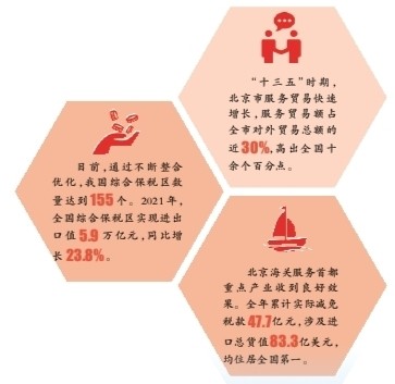 兩年多來(lái),北京“兩區(qū)”建設(shè)成效突出、亮點(diǎn)紛呈。作為創(chuàng)新示范者,北京海關(guān)助力天竺綜保區(qū)加快打造具有服務(wù)貿(mào)易特色的綜合保稅區(qū),為北京開(kāi)放發(fā)展先行先試前沿政策,為我國(guó)海關(guān)特殊監(jiān)管區(qū)域創(chuàng)新發(fā)展探索經(jīng)驗(yàn)。2021年度,天竺綜保區(qū)進(jìn)出口值、營(yíng)業(yè)收入、屬地稅收分別同比增長(zhǎng)37.6%、25.1%、22.1%,其中藥品藥械、文化藝術(shù)品進(jìn)口規(guī)模分別占到全國(guó)總量的1/5、1/3。目前,園區(qū)形成了醫(yī)療健康、文化貿(mào)易、升級(jí)型消費(fèi)、航空服務(wù)等重點(diǎn)產(chǎn)業(yè)。