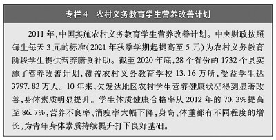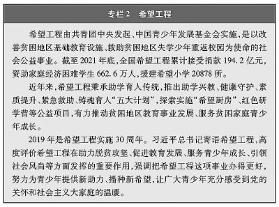 教育機(jī)會(huì)更加均等。中國(guó)教育事業(yè)優(yōu)先發(fā)展不斷深化,中國(guó)青年享有更加平等、更高質(zhì)量的教育機(jī)會(huì)。2021年,中國(guó)義務(wù)教育鞏固率達(dá)95.4%;高中階段毛入學(xué)率達(dá)91.4%;高等教育毛入學(xué)率達(dá)57.8%、在學(xué)總規(guī)模達(dá)4430萬(wàn)人,居世界第一,越來(lái)越多的青年打開(kāi)了通往成功成才大門(mén)的重要路徑。覆蓋學(xué)前教育至研究生教育的學(xué)生資助政策體系建成且日趨完善,2020年資助資金總額超過(guò)2400億元、資助學(xué)生近1.5億人次,實(shí)現(xiàn)“三個(gè)全覆蓋”②。義務(wù)教育階段進(jìn)城務(wù)工人員隨遷子女、農(nóng)村和貧困地區(qū)學(xué)生等群體受教育權(quán)益得到充分保障。2020年,85.8%的進(jìn)城務(wù)工人員隨遷子女在公辦學(xué)校就讀或享受政府購(gòu)買(mǎi)學(xué)位服務(wù);2012年至2021年,農(nóng)村和貧困地區(qū)重點(diǎn)高校專(zhuān)項(xiàng)招生計(jì)劃定向招生超過(guò)82萬(wàn)人,讓更多的青年公平享有接受更好教育的機(jī)會(huì),阻斷貧困的代際傳遞。