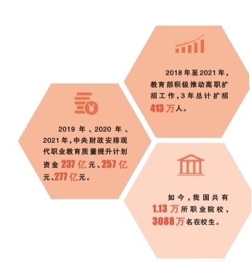 服務(wù)地方發(fā)展,還有實(shí)打?qū)嵉臄?shù)字支撐。2019年高職擴(kuò)招116.5萬人、2020年高職擴(kuò)招157.4萬人、2021年高職擴(kuò)招139.4萬人,他們中有退役軍人、下崗失業(yè)人員、農(nóng)民工。高職擴(kuò)招為社會培養(yǎng)高素質(zhì)技術(shù)技能人才的同時,也有效緩解了嚴(yán)峻的就業(yè)形勢。