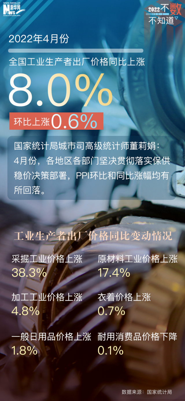 從全國工業(yè)生產(chǎn)者出廠價(jià)格指數(shù)(PPI)看,盡管國際大宗商品價(jià)格高位運(yùn)行,但各地區(qū)各部門貫徹落實(shí)保供穩(wěn)價(jià)決策部署,4月份PPI同比上漲8%,漲幅比上月回落0.3個百分點(diǎn)。