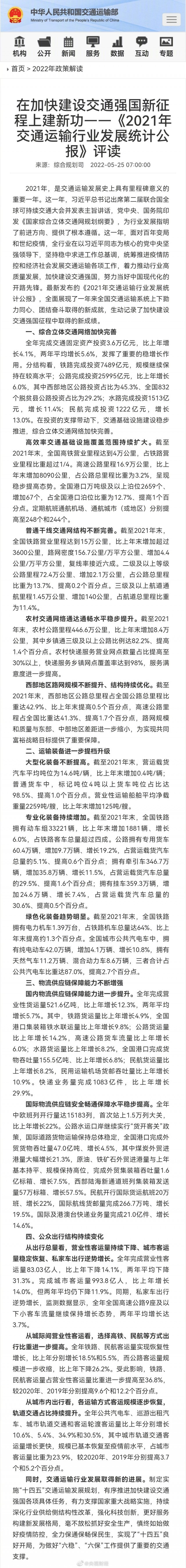 - 《2021年交通運輸行業(yè)發(fā)展統(tǒng)計公報》發(fā)布 我國綜合立體交通網(wǎng)絡加快完善