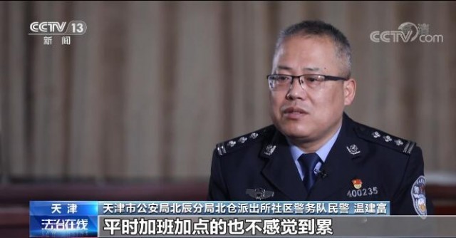 天津市公安局北辰分局北倉派出所社區(qū)警務隊民警 溫建富:管的時間也長了,老百姓這關系也融洽了,建立了深厚的感情,關系特別好,平時加班加點也不感到累。
