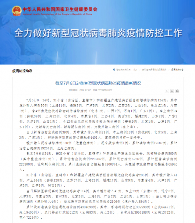 截至7月6日24時,據(jù)31個?。ㄗ灾螀^(qū)、直轄市)和新疆生產(chǎn)建設(shè)兵團報告,現(xiàn)有確診病例809例(其中重癥病例1例),累計治愈出院病例220265例,累計死亡病例5226例,累計報告確診病例226300例,現(xiàn)有疑似病例1例。累計追蹤到密切接觸者4300874人,尚在醫(yī)學(xué)觀察的密切接觸者65940人。