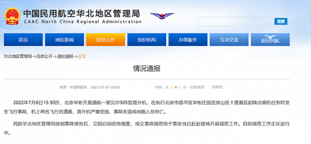 據(jù)民航局華北地區(qū)管理局網(wǎng)站7月7日消息,2022年7月6日15:30許,北京華彬天星通航一架貝爾505型直升機,在執(zhí)行北京市昌平區(qū)華彬莊園至房山區(qū)十渡景區(qū)起降點調機任務時發(fā)生飛行事故,機上兩名飛行員遇難,直升機嚴重受損,事故未造成地面人員傷亡。