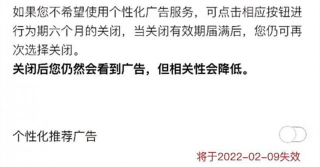 警惕用戶這種拒絕權(quán)流于形式,需要平臺自覺維護(hù)。記者通過對比發(fā)現(xiàn),在其他平臺個性化廣告設(shè)置端口,明顯提示“你可以開啟或關(guān)閉服務(wù),或管理廣告興趣標(biāo)簽。廣告總數(shù)不會因此變化?!币簿鸵馕吨鴮⑦x擇或拒絕權(quán)交到了用戶手中,雖然關(guān)閉后還是會接收到隨機(jī)推送的廣告,但這些廣告并非是針對用戶個人興趣點(diǎn)“計(jì)算”出來的。