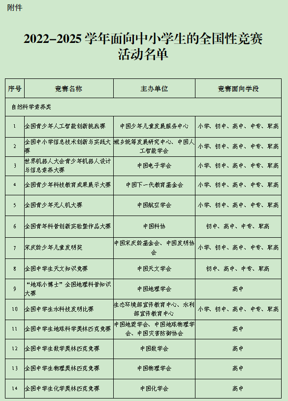 教育部辦公廳今天發(fā)布通知,公示2022-2025學(xué)年面向中小學(xué)生的全國(guó)性競(jìng)賽活動(dòng)名單。