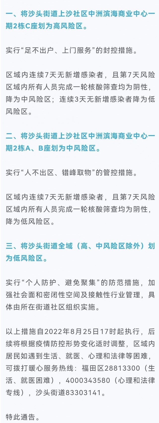 8月25日,廣東省深圳市福田區(qū)新型冠狀病毒肺炎疫情防控指揮部發(fā)布通告稱,根據(jù)當前福田區(qū)疫情防控工作需要,按照國務院應對新型冠狀病毒肺炎疫情聯(lián)防聯(lián)控機制綜合組《新型冠狀病毒肺炎疫情防控方案(第九版)》和《廣東省新冠肺炎本地疫情應急處置方案(第五版)》相關規(guī)定,經(jīng)專家組研判,自2022年8月25日起,福田區(qū)在沙頭街道劃定高風險區(qū)、中風險區(qū)、低風險區(qū)如下: