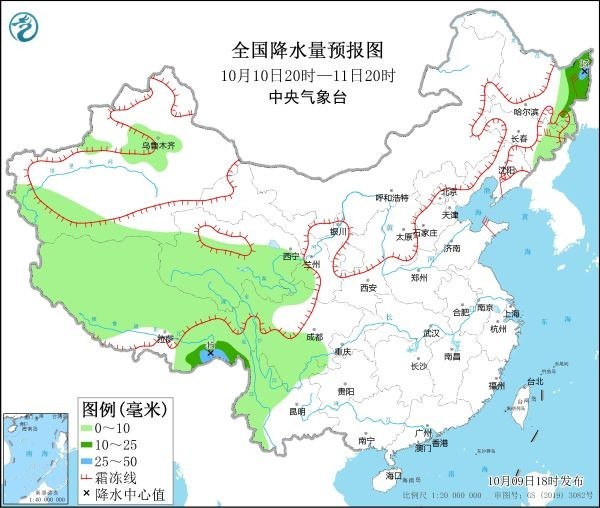 10月9日20時(shí)至10日20時(shí),內(nèi)蒙東南部、遼寧西部和北部、吉林東南部等地有小到中雪或雨夾雪,局部有大雪或暴雪。內(nèi)蒙古東南部、黑龍江東部、吉林大部、遼寧西北部、西藏西南部和東部、云南西部等地部分地區(qū)有中到大雨,其中,吉林東部等地局地有暴雨(50~80毫米)。內(nèi)蒙古中東部、黑龍江西南部、吉林西部、遼寧、河北北部、天津、山東半島、江蘇東部、浙江中北部等地部分地區(qū)有4~6級風(fēng),陣風(fēng)7~8級(見圖2)。渤海、渤海海峽、黃海大部、東海西部、臺灣海峽、臺灣以東洋面、巴士海峽、南海北部、北部灣將有8~9級、陣風(fēng)10~11級的大風(fēng)。