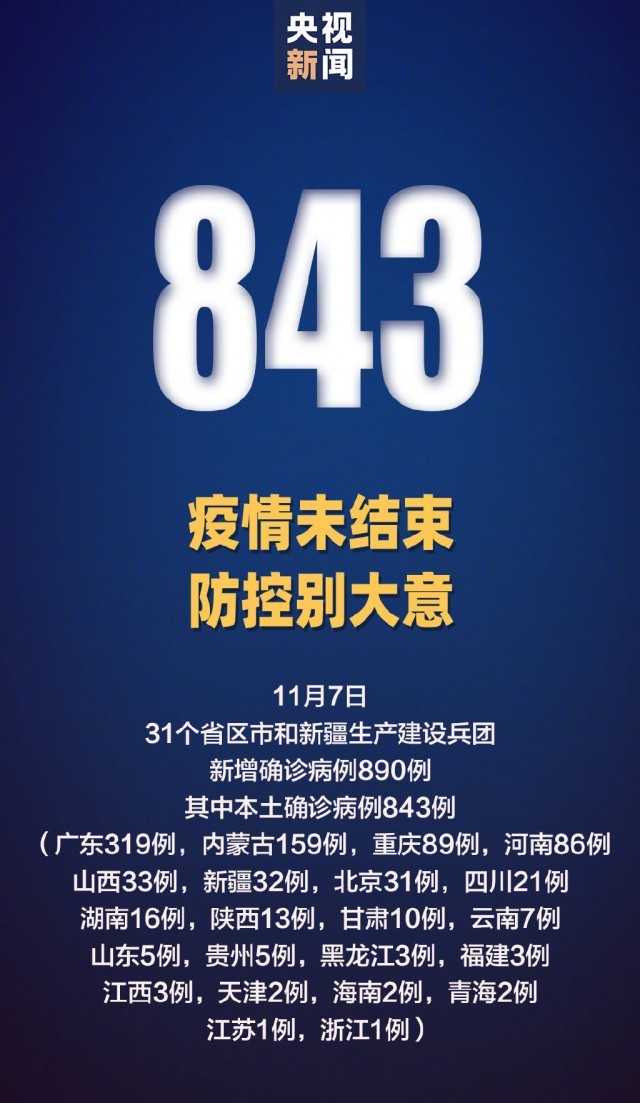 11月7日0—24時,31個?。ㄗ灾螀^(qū)、直轄市)和新疆生產(chǎn)建設(shè)兵團(tuán)報告新增確診病例890例。其中境外輸入病例47例(福建12例,廣東12例,四川8例,北京5例,天津3例,上海3例,遼寧2例,江蘇1例,山東1例),含2例由無癥狀感染者轉(zhuǎn)為確診病例(廣東1例,四川1例);本土病例843例(廣東319例,內(nèi)蒙古159例,重慶89例,河南86例,山西33例,新疆32例,北京31例,四川21例,湖南16例,陜西13例,甘肅10例,云南7例,山東5例,貴州5例,黑龍江3例,福建3例,江西3例,天津2例,海南2例,青海2例,江蘇1例,浙江1例),含152例由無癥狀感染者轉(zhuǎn)為確診病例(廣東121例,甘肅9例,四川7例,北京3例,重慶3例,福建2例,湖南2例,陜西2例,山西1例,黑龍江1例,浙江1例)。無新增死亡病例。無新增疑似病例。