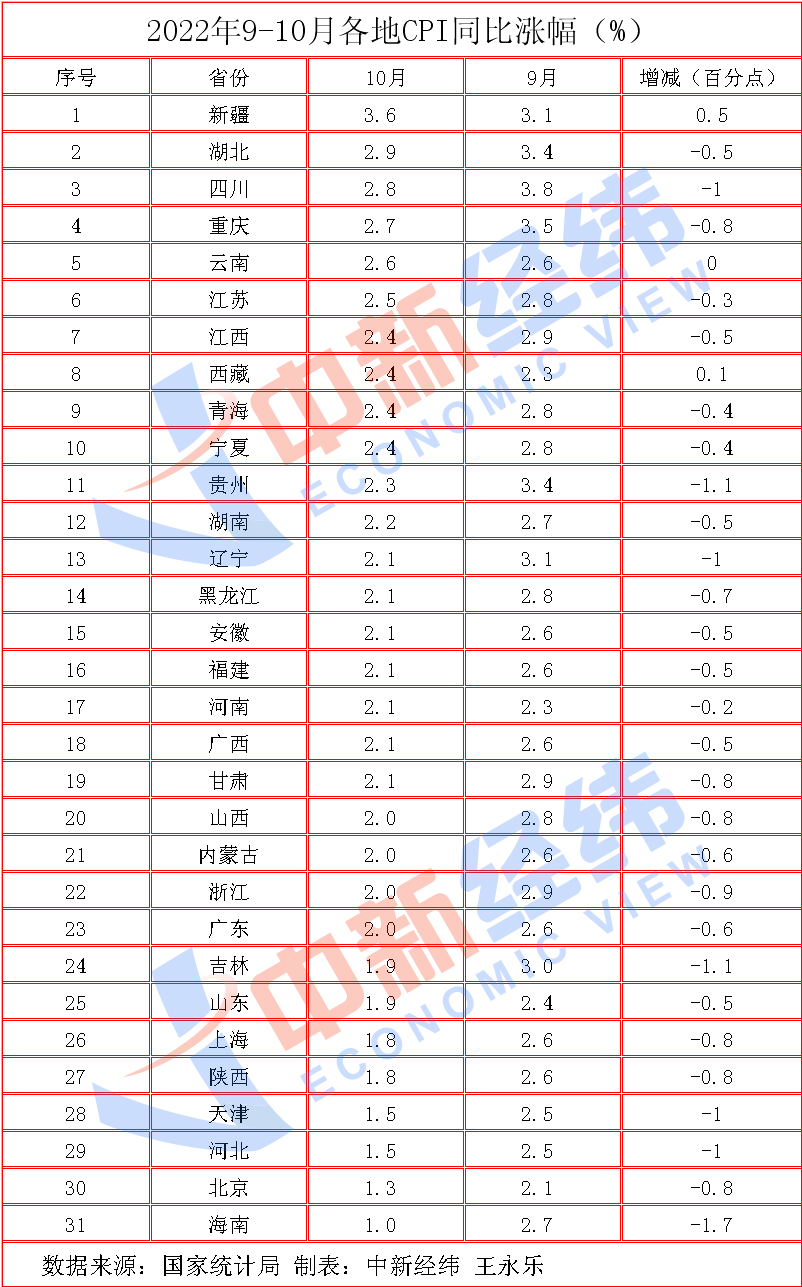 中新經(jīng)緯11月15日報道 日前,國家統(tǒng)計局公布了31省份2022年10月居民消費價格指數(shù)(CPI)。中新經(jīng)緯梳理發(fā)現(xiàn),10月,28省份CPI同比漲幅低于上月。其中,新疆最高為漲3.6%,海南最低漲1.0%。