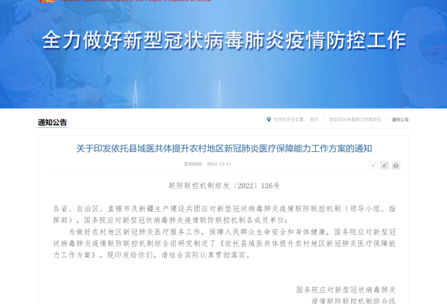 為做好農(nóng)村地區(qū)新冠肺炎醫(yī)療服務(wù)工作,保障高齡合并基礎(chǔ)疾病等重癥風(fēng)險較高的感染者及時救治,在農(nóng)村地區(qū),以縣域醫(yī)共體為載體,提升縣級醫(yī)院重癥救治能力,發(fā)揮鄉(xiāng)鎮(zhèn)衛(wèi)生院和村衛(wèi)生室健康監(jiān)測作用,最大可能降低重癥率、病亡率,國務(wù)院聯(lián)防聯(lián)控機制11日發(fā)布《關(guān)于印發(fā)依托縣域醫(yī)共體提升農(nóng)村地區(qū)新冠肺炎醫(yī)療保障能力工作方案的通知》(下稱“方案”)。