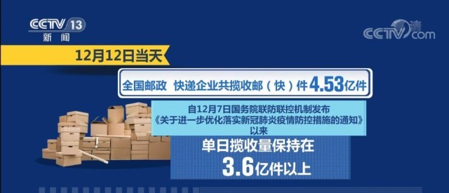 國家郵政局?jǐn)?shù)據(jù)顯示,12月1日—12日,郵政快遞行業(yè)攬收量約為43.03億件,同比上升5.6%。12月12日當(dāng)天,全國郵政、快遞企業(yè)共攬收郵(快)件4.53億件。自12月7日國務(wù)院聯(lián)防聯(lián)控機(jī)制發(fā)布《關(guān)于進(jìn)一步優(yōu)化落實(shí)新冠肺炎疫情防控措施的通知》以來,單日攬收量保持在3.6億件以上。