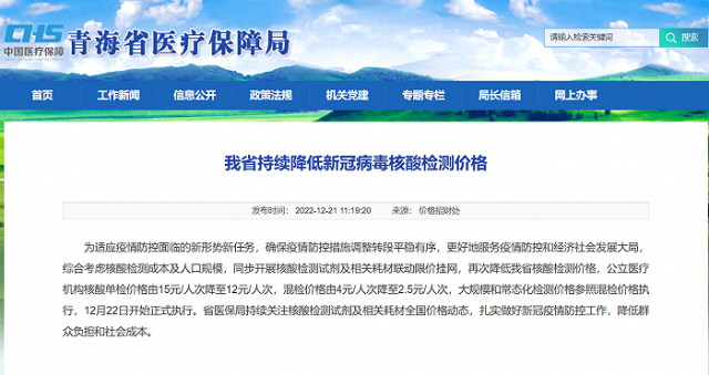據(jù)青海省醫(yī)療保障局網(wǎng)站消息,為適應(yīng)疫情防控面臨的新形勢(shì)新任務(wù),確保疫情防控措施調(diào)整轉(zhuǎn)段平穩(wěn)有序,更好地服務(wù)疫情防控和經(jīng)濟(jì)社會(huì)發(fā)展大局,綜合考慮核酸檢測(cè)成本及人口規(guī)模,同步開展核酸檢測(cè)試劑及相關(guān)耗材聯(lián)動(dòng)限價(jià)掛網(wǎng),再次降低青海省核酸檢測(cè)價(jià)格,公立醫(yī)療機(jī)構(gòu)核酸單檢價(jià)格由15元/人次降至12元/人次,混檢價(jià)格由4元/人次降至2.5元/人次,大規(guī)模和常態(tài)化檢測(cè)價(jià)格參照混檢價(jià)格執(zhí)行,12月22日開始正式執(zhí)行。省醫(yī)保局持續(xù)關(guān)注核酸檢測(cè)試劑及相關(guān)耗材全國價(jià)格動(dòng)態(tài),扎實(shí)做好新冠疫情防控工作,降低群眾負(fù)擔(dān)和社會(huì)成本。