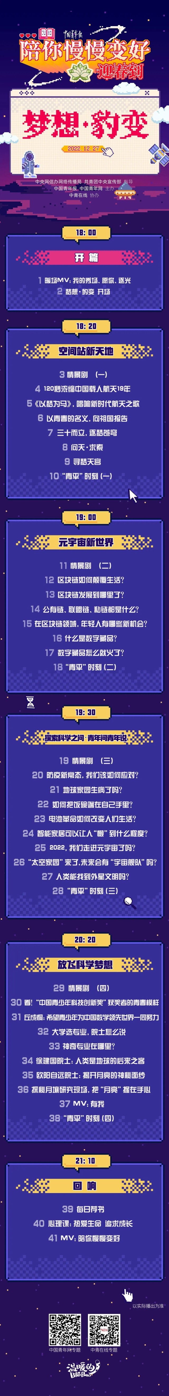在這場(chǎng)聯(lián)播節(jié)目中,4位年輕記者將通過自己的經(jīng)歷和故事,和大家一起回顧2022年與科技創(chuàng)新有關(guān)的瞬間,重溫那些帶給我們“夢(mèng)想”和“豹變”的激情時(shí)刻。聯(lián)播由空間站新天地、元宇宙新世界、探索科學(xué)之問、放飛科學(xué)夢(mèng)想等四大篇章組成,重磅環(huán)節(jié)“探索科學(xué)之問”將聯(lián)合北京市科協(xié),共同推出聯(lián)名款“青年問青年說(shuō)”,青年科學(xué)家和大學(xué)生一起盤點(diǎn)這些熱點(diǎn)科技問題:防疫新常態(tài),我們?cè)撊绾螒?yīng)對(duì)?極端天氣頻發(fā),地球家園生病了?2022年,我們走進(jìn)元宇宙了嗎?“太空家園”來(lái)了,未來(lái)會(huì)不會(huì)有“宇宙艦隊(duì)”…… 12月27日,我們不見不散。