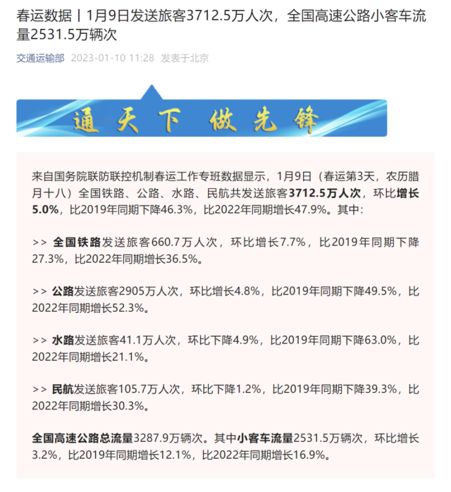 來自國務(wù)院聯(lián)防聯(lián)控機(jī)制春運(yùn)工作專班數(shù)據(jù)顯示,1月9日(春運(yùn)第3天,農(nóng)歷臘月十八)全國鐵路、公路、水路、民航共發(fā)送旅客3712.5萬人次,環(huán)比增長5.0%,比2019年同期下降46.3%,比2022年同期增長47.9%。其中: