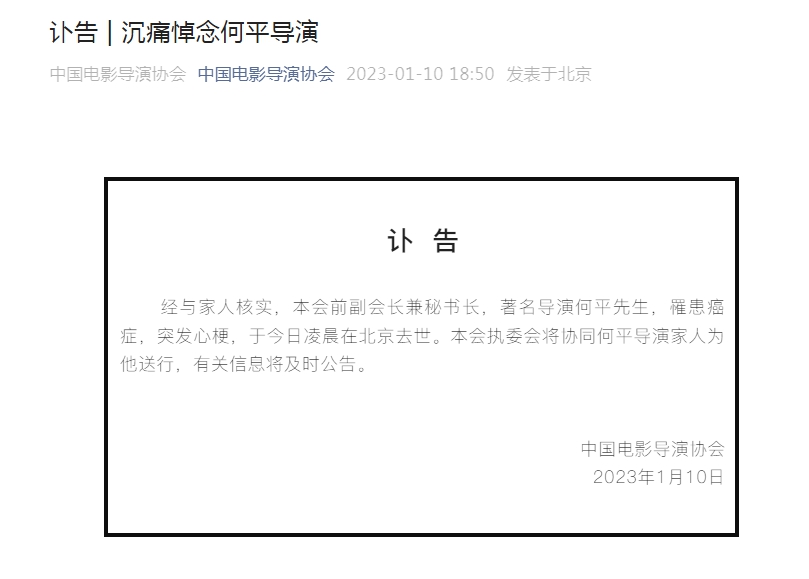 中新網(wǎng)1月10日電 據(jù)中國電影導演協(xié)會消息,經(jīng)與家人核實,中國電影導演協(xié)會前副會長兼秘書長,著名導演何平先生,罹患癌癥,突發(fā)心梗,于1月10日凌晨在北京去世。中國電影導演協(xié)會執(zhí)委會將協(xié)同何平導演家人為他送行,有關信息將及時公告。