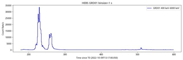 國(guó)家天文臺(tái)和上海技術(shù)物理研究所研制的EP探路者龍蝦眼X射線成像儀(LEIA)于10月12日也成功對(duì)這一伽馬射線暴開展了觀測(cè),探測(cè)到了伽馬射線暴X射線余輝。這也是國(guó)際上首次用龍蝦眼型X射線望遠(yuǎn)鏡探測(cè)到伽馬射線暴。