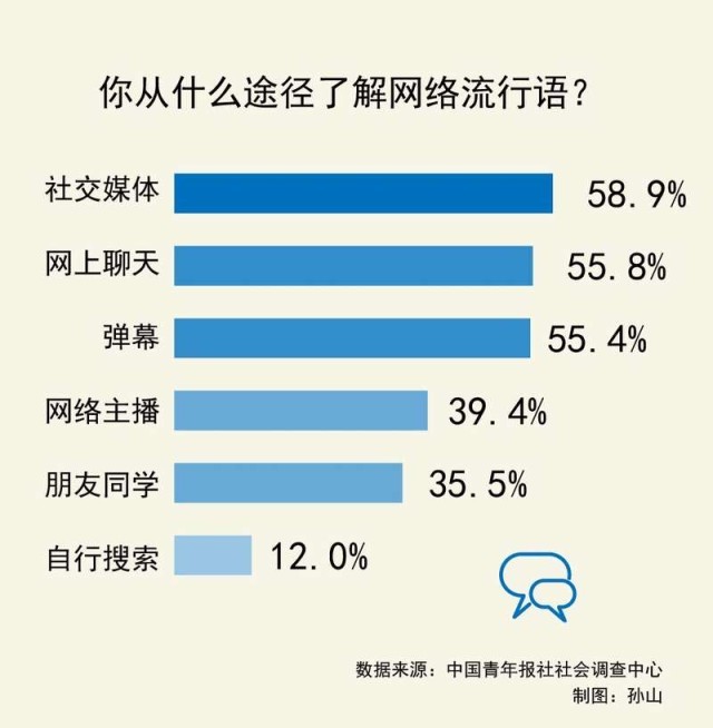 網(wǎng)絡(luò)流行語因生動(dòng)活潑的特點(diǎn),受到年輕人的喜愛,但不分場(chǎng)合地過度使用網(wǎng)絡(luò)流行語,也會(huì)帶來負(fù)面影響。近日,中國青年報(bào)社社會(huì)調(diào)查中心聯(lián)合問卷網(wǎng)(wenjuan.com),對(duì)1217名受訪青年進(jìn)行的一項(xiàng)調(diào)查顯示,社交媒體是受訪青年了解網(wǎng)絡(luò)流行語的主要途徑,61.5%的受訪青年認(rèn)為過度使用網(wǎng)絡(luò)流行語會(huì)在一定程度上沖擊傳統(tǒng)語言文化。