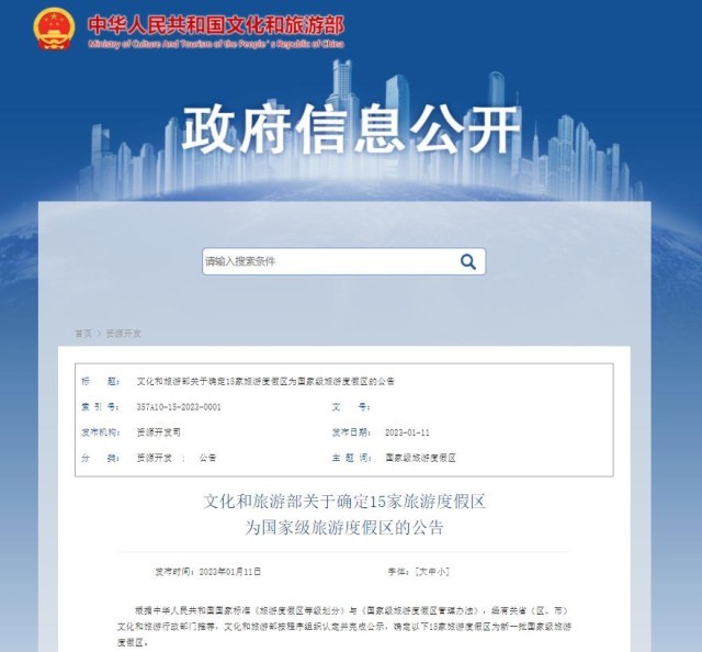 央視網(wǎng)消息:1月11日,文化和旅游部發(fā)布《關(guān)于確定15家旅游度假區(qū)為國家級旅游度假區(qū)的公告》。具體內(nèi)容如下: