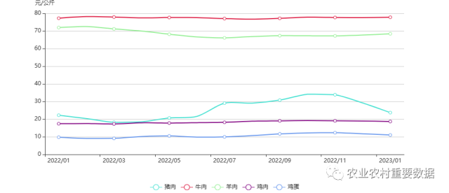 2023年1月,羊肉批發(fā)價格為68.48元/公斤,比上月上漲1.06%;豬肉、雞肉和雞蛋批發(fā)價格分別為23.72元/公斤、18.68元/公斤、11.01元/公斤,比上月分別下降18.82%、1.42%、6.14%;牛肉批發(fā)價格為77.88元/公斤,與上月基本持平。