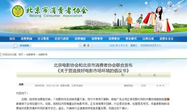 北京消費者協(xié)會倡議:維護電影市場秩序 加強對放映質量管理