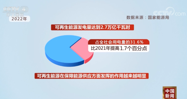 2022年,中國可再生能源呈現(xiàn)發(fā)展速度快、運(yùn)行質(zhì)量好、利用水平高、產(chǎn)業(yè)競爭力強(qiáng)的良好態(tài)勢,取得了諸多里程碑式的新成績。2022年,中國風(fēng)電、光伏發(fā)電量達(dá)到1.19萬億千瓦時,比2021年增加2073億千瓦時,同比增長21%,接近全國城鄉(xiāng)居民生活用電量。2022年,可再生能源發(fā)電量達(dá)到2.7萬億千瓦時,占全社會用電量的31.6%,比2021年提高1.7個百分點(diǎn),可再生能源在保障能源供應(yīng)方面發(fā)揮的作用越來越明顯,可再生能源新增裝機(jī)已成為中國電力新增裝機(jī)的主體。
