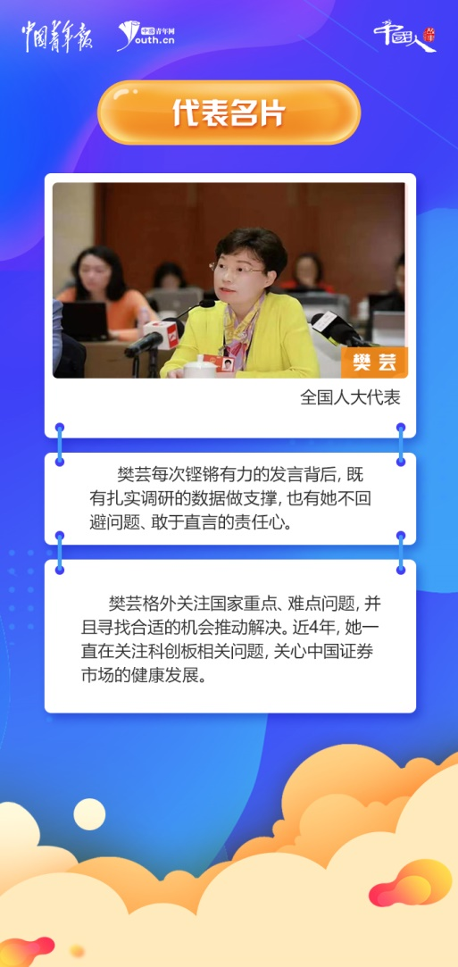 2020年,在十三屆全國(guó)人大三次會(huì)議上,她提出改革不適應(yīng)的監(jiān)管模式、依法實(shí)施注冊(cè)備案制等7條建議,推動(dòng)了新版證券法改革落地。