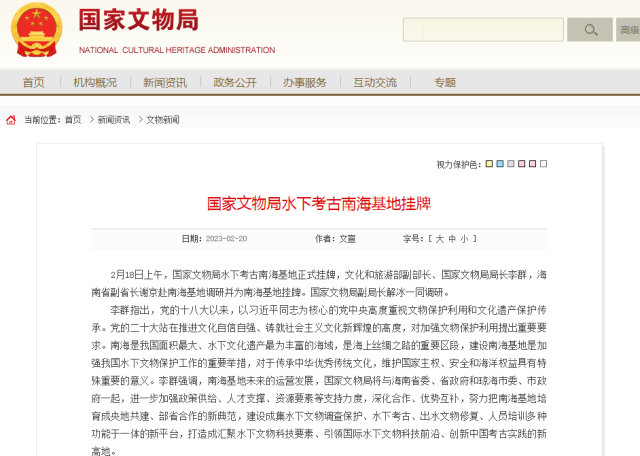 文化和旅游部副部長、國家文物局局長李群表示,南海是我國面積最大、水下文化遺產最為豐富的海域,是海上絲綢之路的重要區(qū)段。國家文物局將努力把南?;嘏嘤裳氲毓步?、部省合作的新典范,建設成集水下文物調查保護、水下考古、出水文物修復、人員培訓多種功能于一體的新平臺,打造成匯聚水下文物科技要素、引領世界水下文物科技前沿、創(chuàng)新中國考古實踐的新高地。