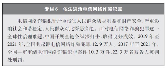 加大網(wǎng)絡(luò)犯罪懲治力度。隨著互聯(lián)網(wǎng)技術(shù)的快速發(fā)展,傳統(tǒng)犯罪加速向以互聯(lián)網(wǎng)為媒介的非接觸式犯罪轉(zhuǎn)變,電信網(wǎng)絡(luò)詐騙、網(wǎng)絡(luò)賭博、網(wǎng)絡(luò)淫穢色情等涉網(wǎng)違法犯罪多發(fā)。中國依法辦理新型網(wǎng)絡(luò)犯罪案件。連續(xù)多年開展“凈網(wǎng)行動”,嚴(yán)厲打擊群眾反映強烈的黑客攻擊破壞、侵犯公民個人信息等違法犯罪活動。持續(xù)推進(jìn)“云劍”“斷卡”“斷流”“拔釘”等專項行動,打擊套路貸、校園貸、“以房養(yǎng)老”、“投資養(yǎng)老”等電信網(wǎng)絡(luò)詐騙犯罪,依法懲處為電信網(wǎng)絡(luò)詐騙犯罪團(tuán)伙提供互聯(lián)網(wǎng)接入、域名注冊、服務(wù)器托管、移動互聯(lián)網(wǎng)應(yīng)用程序制作開發(fā)、網(wǎng)絡(luò)支付、引流推廣等服務(wù)支撐的黑灰產(chǎn)業(yè)。完善國家反詐大數(shù)據(jù)平臺和反詐移動互聯(lián)網(wǎng)應(yīng)用程序,建設(shè)國家涉詐黑樣本庫,完善快速止付凍結(jié)機(jī)制、涉詐資金返還機(jī)制。堅決打擊網(wǎng)絡(luò)賭博犯罪行為,從嚴(yán)治理網(wǎng)絡(luò)淫穢色情。網(wǎng)絡(luò)犯罪治理工作取得明顯成效,人民群眾安全感有效提升,社會更加和諧穩(wěn)定。