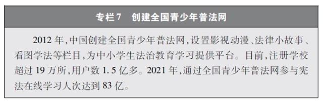 加強青少年網(wǎng)絡(luò)法治宣傳教育。青少年是祖國的未來、民族的希望。青少年網(wǎng)民在中國網(wǎng)民中的占比逐步增長。作為互聯(lián)網(wǎng)的“原住民”,青少年是網(wǎng)上學(xué)習(xí)、交流、生活最活躍的參與者、實踐者,其合法權(quán)益也更易受到網(wǎng)絡(luò)違法活動的侵害。中國從保護(hù)青少年網(wǎng)絡(luò)權(quán)益,促進(jìn)青少年健康成長、全面發(fā)展出發(fā),遵循青少年身心發(fā)展規(guī)律,貼近青少年學(xué)習(xí)生活實際,聚焦網(wǎng)絡(luò)沉迷、網(wǎng)絡(luò)欺凌、網(wǎng)絡(luò)淫穢色情信息等重點問題,通過普法微綜藝、兒童普法話劇、網(wǎng)絡(luò)普法故事廣播、網(wǎng)絡(luò)普法云課堂、學(xué)法用法知識競賽、法治副校長進(jìn)校園、編寫網(wǎng)絡(luò)普法讀本等生動活潑、豐富多彩的形式開展法治宣傳教育,逐步形成了政府、社會、學(xué)校、家庭相結(jié)合的法治宣傳教育格局,為提升青少年網(wǎng)民法治意識和網(wǎng)絡(luò)安全素養(yǎng)提供了全面保障。
