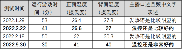 問題描述:博主于2022年1月至9月先后4次對不同手機(jī)進(jìn)行溫度測試。在經(jīng)過一定時間運(yùn)行游戲后,使用測溫儀對手機(jī)正面及背面進(jìn)行測溫,并對手機(jī)的溫控效果進(jìn)行點(diǎn)評,4次測評結(jié)果出入較大,不同品牌的手機(jī)測評前后標(biāo)準(zhǔn)不一。