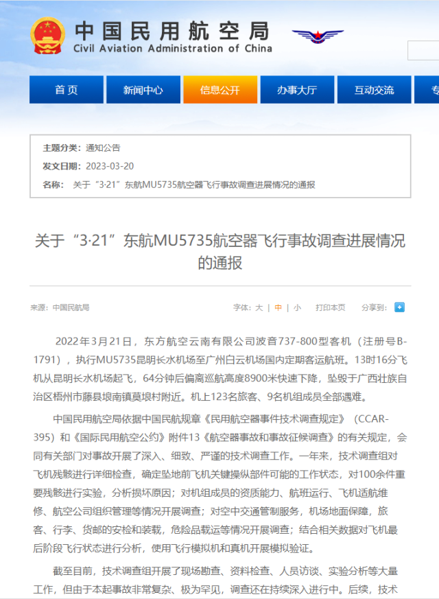 中國民航局發(fā)布《關(guān)于“3·21”東航MU5735航空器飛行事故調(diào)查進(jìn)展情況的通報》