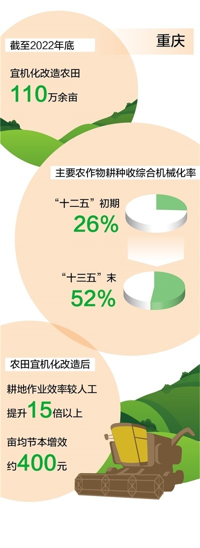 2015年起,重慶著眼于提升農(nóng)業(yè)機(jī)械化水平,探索推進(jìn)丘陵山區(qū)農(nóng)田宜機(jī)化改造。截至2022年底,重慶已對(duì)110萬余畝農(nóng)田進(jìn)行了宜機(jī)化改造,主要農(nóng)作物耕種收綜合機(jī)械化率由“十二五”初期的26%提高到“十三五”末的52%。