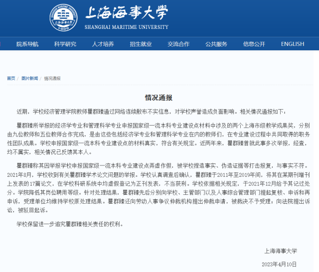 央視網(wǎng)消息:4月10日,上海海事大學(xué)在官網(wǎng)發(fā)布情況通報(bào)稱,近期,學(xué)校經(jīng)濟(jì)管理學(xué)院教師瞿群臻通過網(wǎng)絡(luò)連續(xù)散布不實(shí)信息,對(duì)學(xué)校聲譽(yù)造成負(fù)面影響。瞿群臻所舉報(bào)的經(jīng)濟(jì)學(xué)專業(yè)和管理科學(xué)專業(yè)申報(bào)國家級(jí)一流本科專業(yè)建設(shè)點(diǎn)材料中涉及的兩個(gè)上海市級(jí)教學(xué)成果獎(jiǎng),分別由九位教師和五位教師合作完成,是由這些包括經(jīng)濟(jì)學(xué)專業(yè)和管理科學(xué)專業(yè)在內(nèi)的教師們,在專業(yè)建設(shè)過程中共同取得的職務(wù)性團(tuán)隊(duì)成果。學(xué)校申報(bào)國家級(jí)一流本科專業(yè)建設(shè)點(diǎn)的材料真實(shí),符合有關(guān)規(guī)定。近兩年來,瞿群臻曾就此事多次舉報(bào),經(jīng)查,均不屬實(shí),相關(guān)情況已反饋其本人。