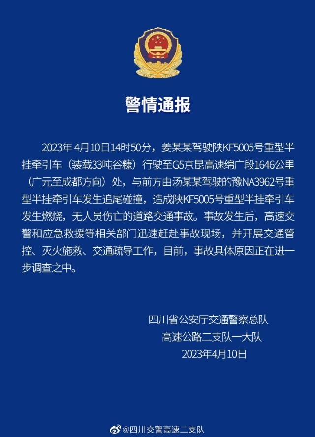 京昆高速綿廣段兩車追尾碰撞發(fā)生燃燒,警方通報(bào):無(wú)人員傷亡