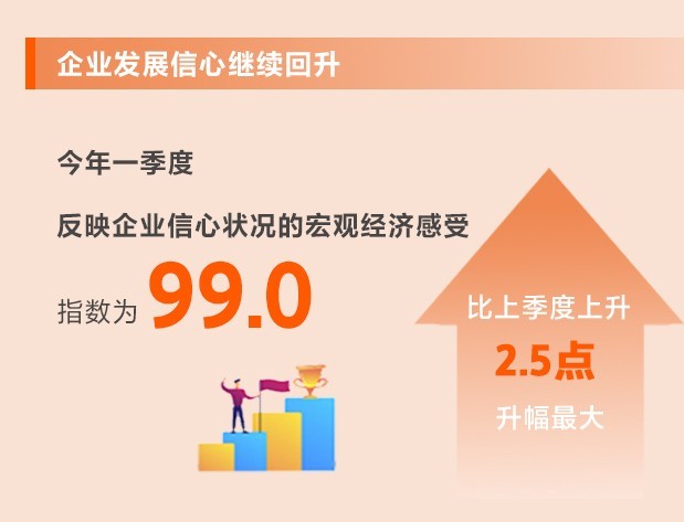 今年以來,我國經(jīng)濟(jì)運(yùn)行持續(xù)回暖,增長動能不斷釋放,發(fā)展信心明顯增強(qiáng)。一季度,反映企業(yè)信心狀況的宏觀經(jīng)濟(jì)感受指數(shù)為99.0,比上季度上升2.5點(diǎn),升幅最大。從宏觀經(jīng)濟(jì)感受指數(shù)的細(xì)項(xiàng)看,宏觀感受指數(shù)為103.6,比上季度上升2.4點(diǎn),高于景氣臨界值100;行業(yè)運(yùn)行指數(shù)為94.3,比上季度上升2.6點(diǎn),升幅較大。