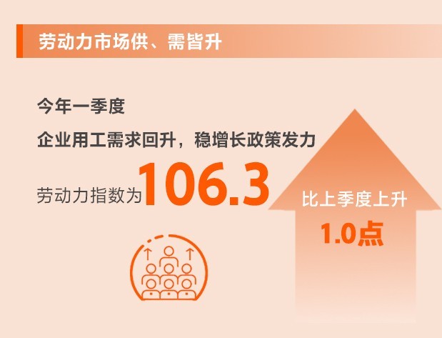 隨著生產(chǎn)生活秩序的恢復(fù),人員流動性的提高,企業(yè)用工需求開始回升,同時穩(wěn)增長政策持續(xù)發(fā)力,從業(yè)人數(shù)有所上升。一季度,勞動力指數(shù)為106.3,比上季度上升1.0點(diǎn)。其中,供應(yīng)指數(shù)為113.6,比上季度上升0.1點(diǎn);需求指數(shù)為98.9,比上季度上升1.9點(diǎn)。