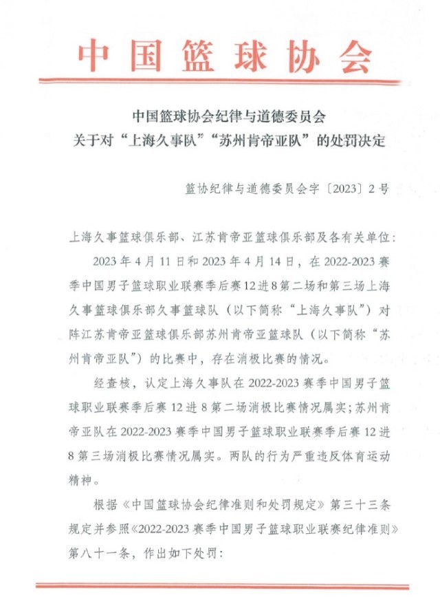 央視網(wǎng)消息:據(jù)@中國籃球協(xié)會 微博消息,4月17日,中國籃球協(xié)會紀(jì)律與道德委員會公布關(guān)于對“上海久事隊(duì)”“蘇州肯帝亞隊(duì)”的處罰決定。
