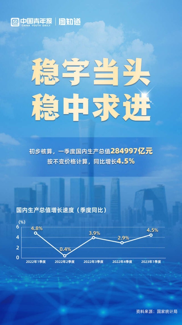 4月18日上午,國家統計局新聞發(fā)言人、國民經濟綜合統計司司長付凌暉在介紹2023年一季度國民經濟運行情況時說,初步核算,一季度國內生產總值284997億元,按不變價格計算,同比增長4.5%。一季度,面對嚴峻復雜的國際環(huán)境和艱巨繁重的國內改革發(fā)展穩(wěn)定任務,我國走出穩(wěn)字當頭、穩(wěn)中求進的經濟運行開局態(tài)勢。
