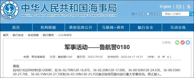 據(jù)中國海事局網(wǎng)站消息,青島海事局發(fā)布航行警告,4月18日9時(shí)至12時(shí),黃海部分海域進(jìn)行重大軍事活動(dòng),禁止駛?cè)搿?/p>