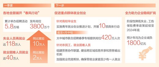強(qiáng)政策,全力助力企業(yè)穩(wěn)崗擴(kuò)崗。優(yōu)化調(diào)整階段性穩(wěn)就業(yè)政策,實(shí)施穩(wěn)崗支持和擴(kuò)崗激勵(lì)措施,通過(guò)擴(kuò)大有效需求、提振市場(chǎng)信心、穩(wěn)定企業(yè)經(jīng)營(yíng)帶動(dòng)更多就業(yè)。階段性降低失業(yè)、工傷保險(xiǎn)費(fèi)率政策延續(xù)實(shí)施至2024年底,預(yù)計(jì)年均為企業(yè)減負(fù)1800億元。