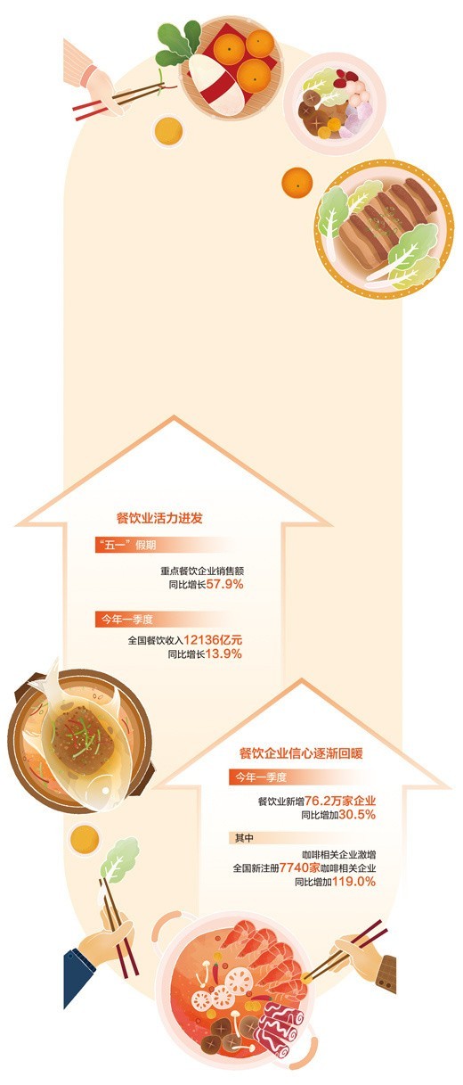 餐飲業(yè)是促消費(fèi)、惠民生、穩(wěn)就業(yè)的重點(diǎn)領(lǐng)域。今年以來,餐飲消費(fèi)一直呈現(xiàn)加快恢復(fù)向好態(tài)勢(shì),一季度全國(guó)餐飲收入同比增長(zhǎng)13.9%,餐飲業(yè)新增企業(yè)數(shù)同比增加30.5%。餐飲業(yè)加快恢復(fù)向好、持續(xù)激發(fā)活力,為恢復(fù)和擴(kuò)大消費(fèi)提供有力支撐。