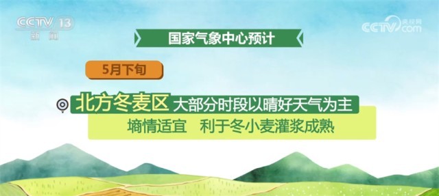 國家氣象中心預(yù)計,5月下旬,北方冬麥區(qū)大部分時段以晴好天氣為主,墑情適宜,利于冬小麥灌漿成熟;江漢、江南及四川盆地、貴州等地有較強降雨,夏收作業(yè)將短暫受阻;江淮大部天氣較好,適宜夏收。