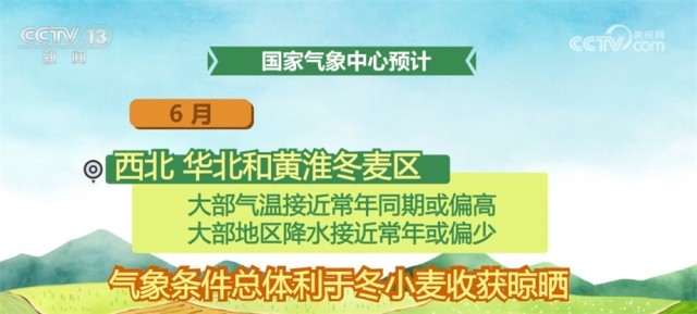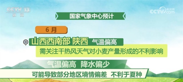 6月,西北、華北和黃淮冬麥區(qū)大部氣溫接近常年同期或偏高,大部地區(qū)降水接近常年或偏少,氣象條件總體利于冬小麥收獲晾曬;但山西西南部、陜西氣溫偏高,需關(guān)注干熱風天氣對小麥產(chǎn)量形成的不利影響,此外,氣溫偏高、降水偏少可能導致部分地區(qū)墑情偏差,不利于夏種。