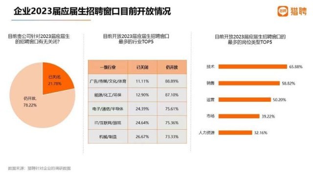 中國(guó)青年報(bào)客戶端訊(中青報(bào)·中青網(wǎng)記者 朱彩云)臨近畢業(yè)季,獵聘大數(shù)據(jù)研究院日前推出的《2023屆高校畢業(yè)生就業(yè)數(shù)據(jù)報(bào)告》顯示,目前有78.22%的企業(yè)仍開放校招窗口,其中廣告/傳媒/文化/教育、能源/化工/環(huán)保行業(yè)的企業(yè)占比分別達(dá)88.89%、87.1%。在招崗位中,技術(shù)、銷售和運(yùn)營(yíng)類需求量位居前三。