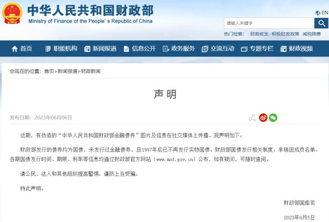 央視網(wǎng)消息:6月6日,財政部網(wǎng)站發(fā)布聲明,近期,有偽造的“中華人民共和國財政部金融債券”圖片及信息在社交媒體上傳播?,F(xiàn)聲明如下: