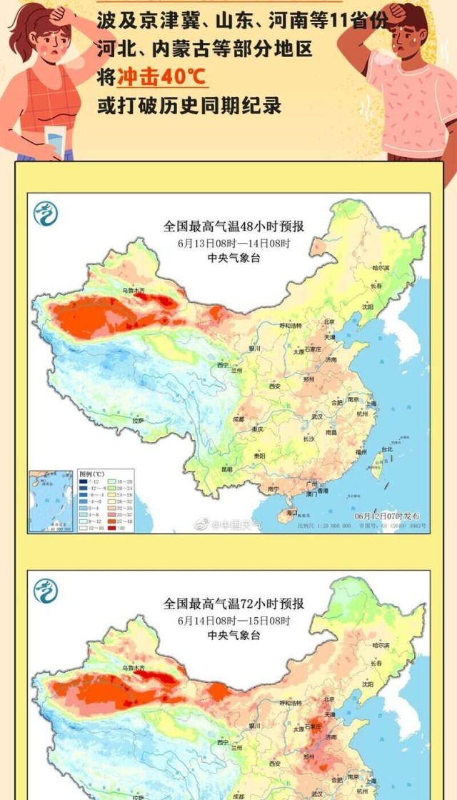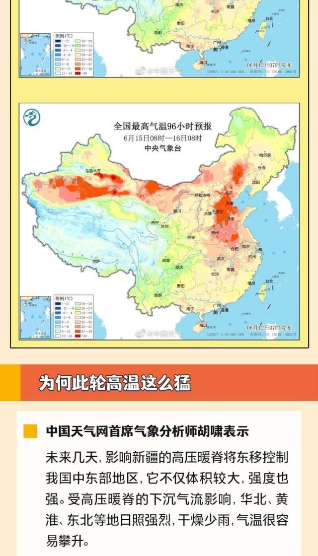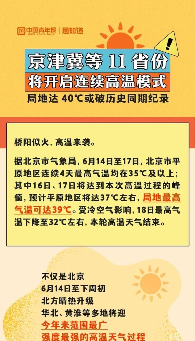 6月14日至下周初,華北、黃淮等多地將迎今年來范圍最廣、強度最強的高溫天氣過程,波及京津冀、山東、河南等11省份,河北、內(nèi)蒙古等部分地區(qū)將沖擊40℃,或打破歷史同期紀錄。全國總工會也發(fā)出提示,各級工會要督促用人單位提供必要的防護用品和高溫作業(yè)休息場所。為何這輪高溫這么猛?有哪些防范高溫天氣的建議?一起來看。