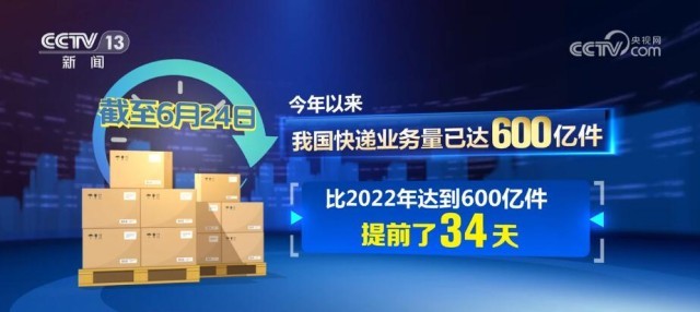 國家郵政局數(shù)據(jù)顯示,截至6月24日,今年以來我國快遞業(yè)務(wù)量已達600億件,比2022年達到600億件提前了34天。